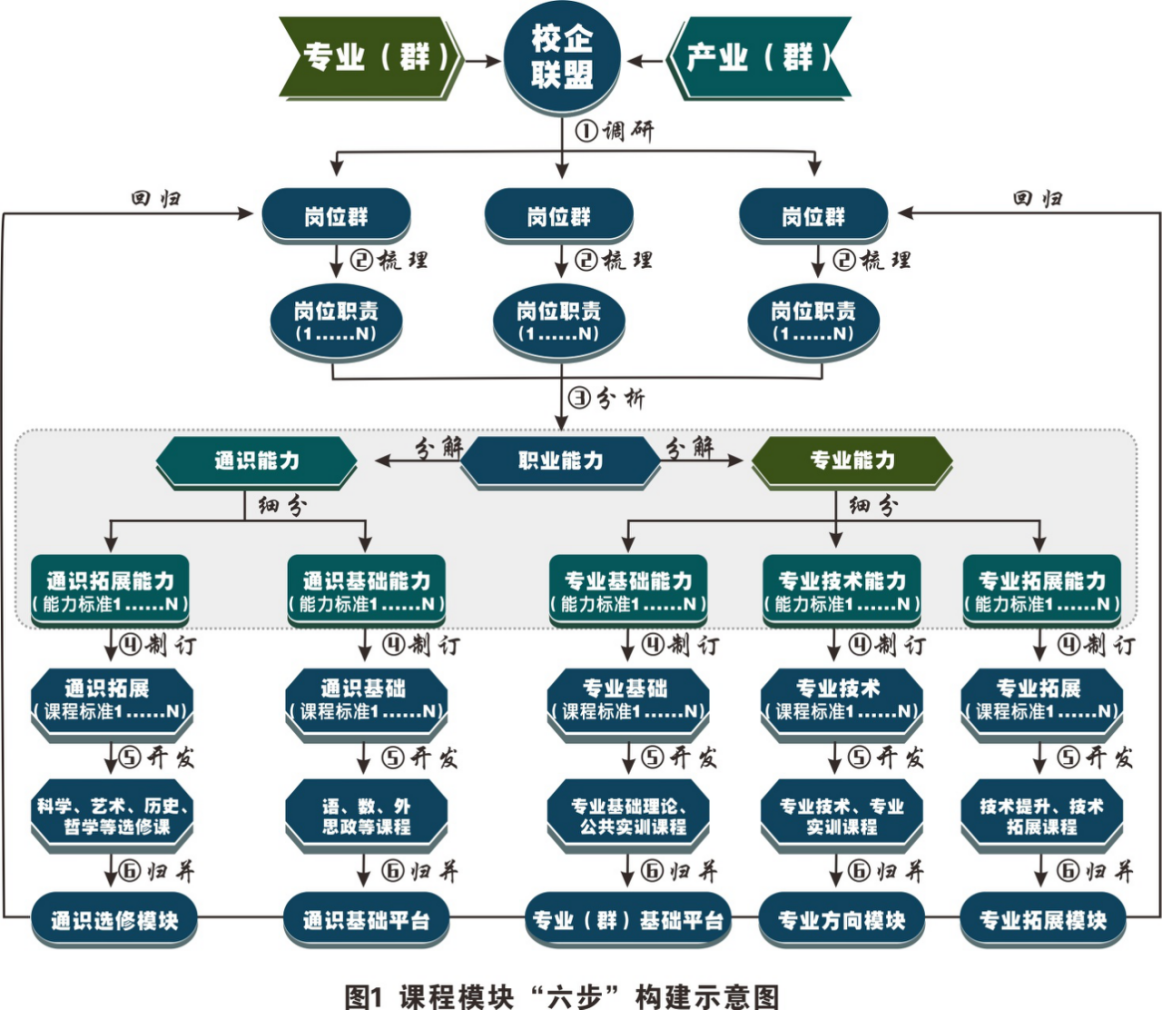 1. 基于能力本 位,协同开发岗位导向课程模块以能力为核心、岗位为导向,依托与华为、中兴共建的6个校企联盟,采用六步构建法校企协同开发课程模块。①调研300余家企业,确定80余个职业岗位;②根据岗位梳理出500余条岗位职责;③借鉴能力结构“二因素”模型,分析出岗位职责对应的通识能力和专业能力,再细分成五大具体能力,构建职业能力框架体系;④细分能力标准1000余条,制订基于能力标准和技术迭代要求的课程标准;⑤结合上下游岗位特征,开发岗位导向的专业课和体现岗位特征的通识课;⑥整合关联岗位课程,归并培养专业能力的课程为专业(群)基础平台、专业方向模块、专业拓展模块,归并支撑通识能力的课程为通识基础平台、通识拓展模块,实现课程模块基于岗位又回归岗位的落地支撑。