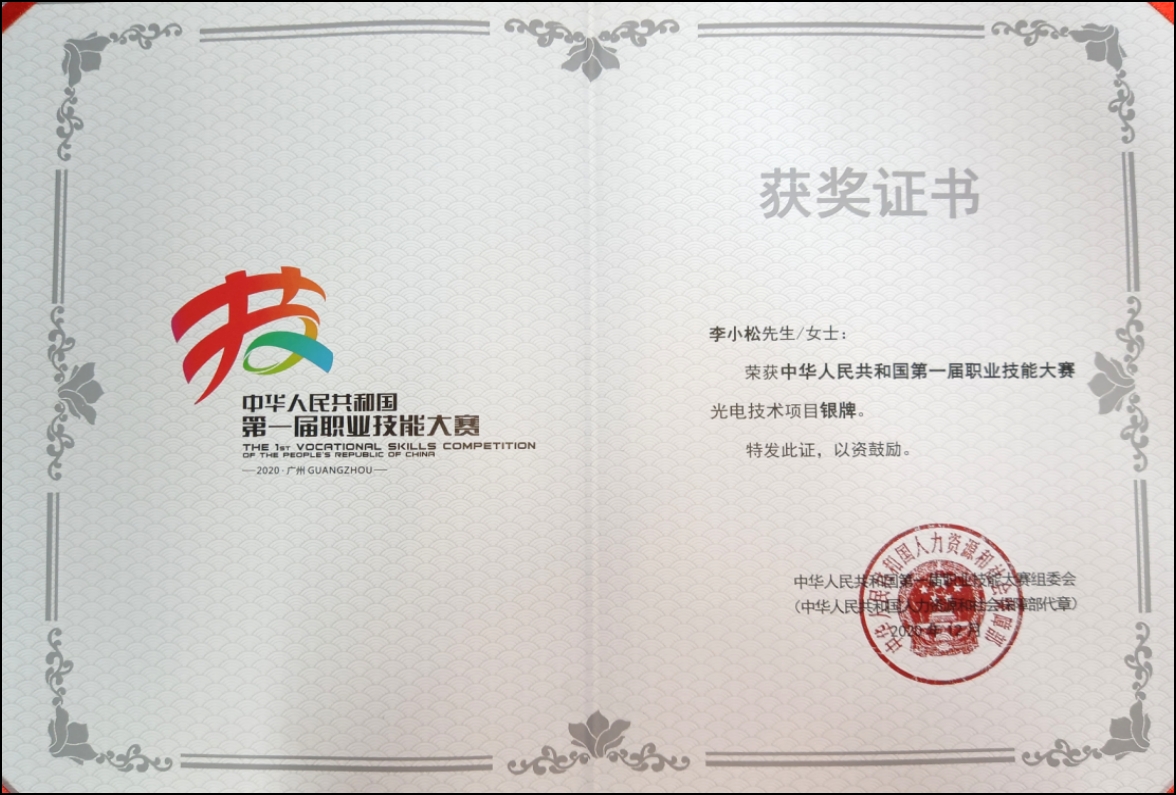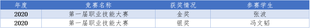 2020年12月,在中华人民共和国第一届职业技能大赛中获得金奖1项、银奖1项。