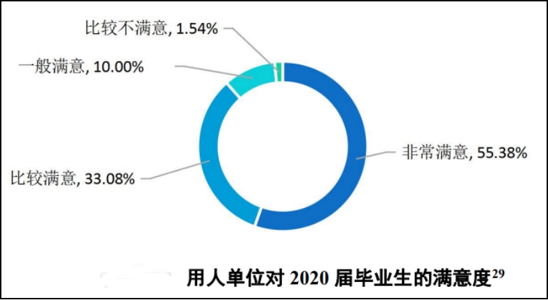 用人单位对2020届毕业生的工作表现的满意度为98.46%,其中评价为“非常满意”的占比相对较高,为55.38%。