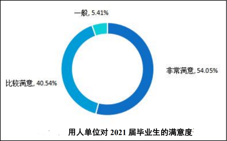 用人单位对2021届毕业生的工作表现的满意度为100.00%,其中评价为“非常满意”的占比相对较高,为54.05%。