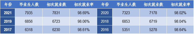 近年来,我校毕业生就业率始终保持在98%以上,见下表。