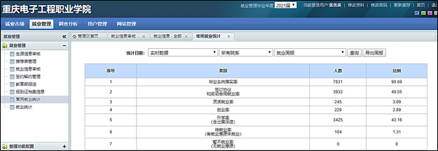 就业管理系统截图 - 2021届毕业生初次就业率为98.69%